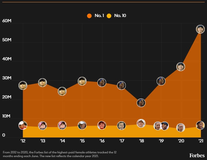 Η ανάπτυξη αυτή είναι εμφανής και στις αμοιβές των αθλητών. Οι δέκα πιο ακριβοπληρωμένες αθλήτριες του πλανήτη αποκόμισαν το 2021 το συνολικο ποσό των 1067 εκατ. δολαρίων προ φόρων, σύμφωνα με τις εκτιμήσεις του Forbes, ποσό αυξημένο κατά 23% σε σύγκριση με το 2020 και κατά 16% υψηλότερο από το προηγούμενο ποσό ρεκόρ των 143,3 εκατ. δολαρίων του 2013. Στην κορυφή της φετινής λίστας η αστέρας του τένις Naomi Osaka, η οποία αποκόμισε κέρδη 57,3 εκατ. δολαρίων, ποσό ρεκόρ για γυναίκα αθλήτρια. Στη δεύτερη θέση βρίσκεται η Serena Williams με 45,9 εκατ. δολάρια.